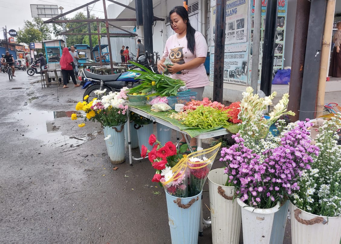 Sementara itu, Sri (38) masih menata tangkai-tangkai bunga yang dijajakannya di sudut pertigaan Jalan Kenanga, Pelutan. Bunga berwarna cerah itu mengundang sekelibat mata yang melihatnya.