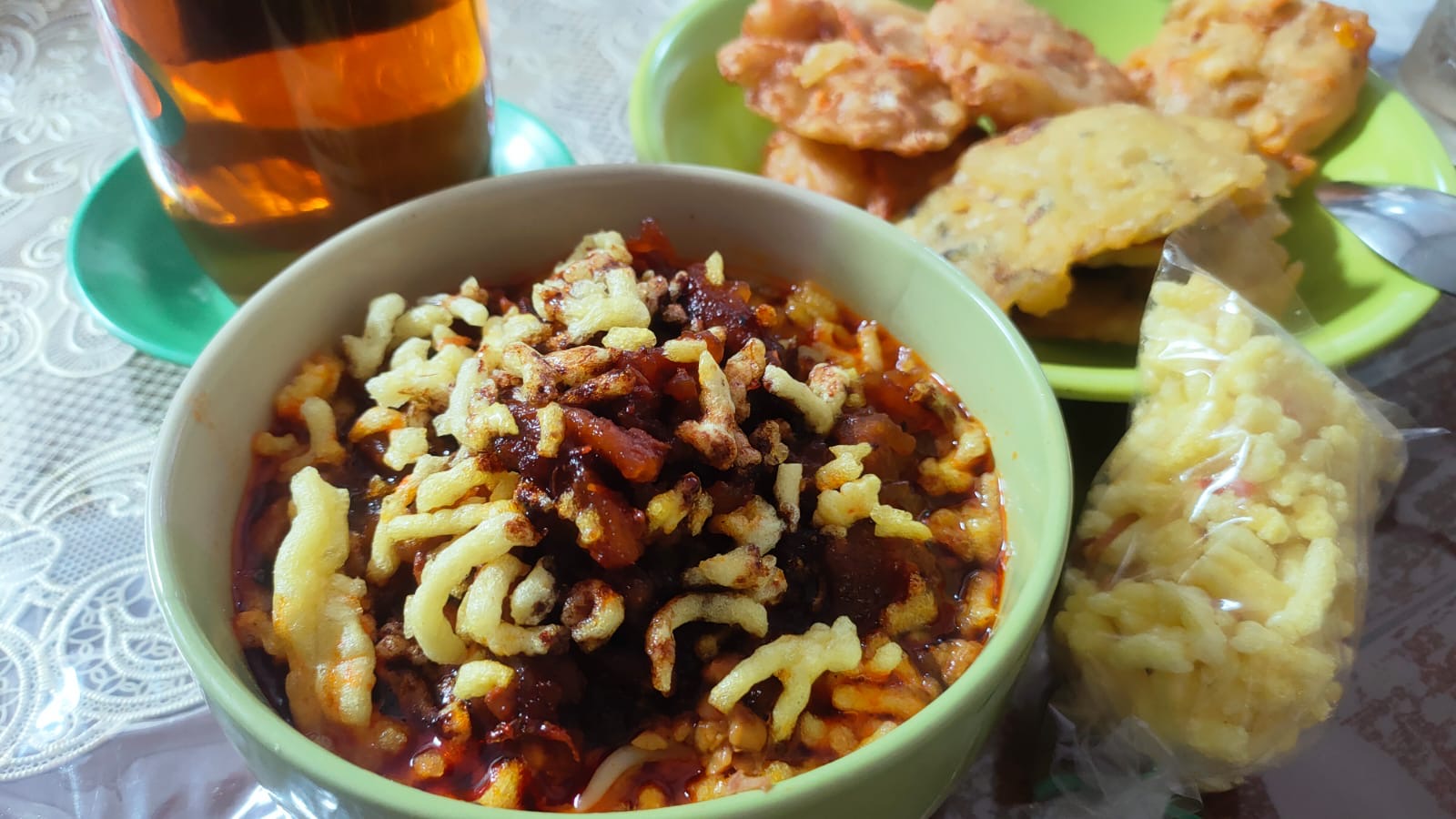 Hidangan ini semakin lengkap dengan taburan kerupuk mie kuning dan bawang goreng.