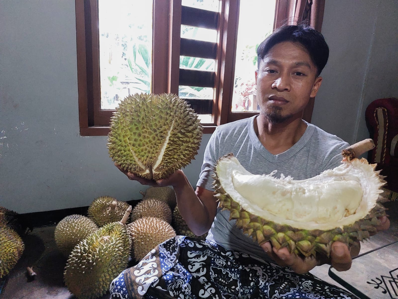 Jika melihat sekilas, orang pasti tak akan menyangka rumah Mualim itu penjaja durian. Pasalnya, tak ada papan atau keterangan, bahkan buah durian yang dipajang di depan rumah durian ini.