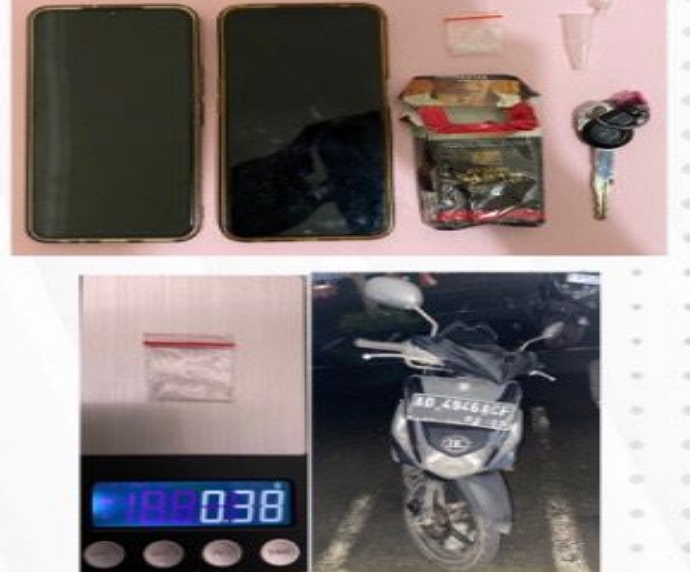 “Barang haram itu, kami temukan dalam genggaman pelaku. Satu paket sabu terbungkus dalam plastik klip transparan dan terbalut isolasi warna hitam seberat 0.38 gram,” kata Kasat Narkoba.