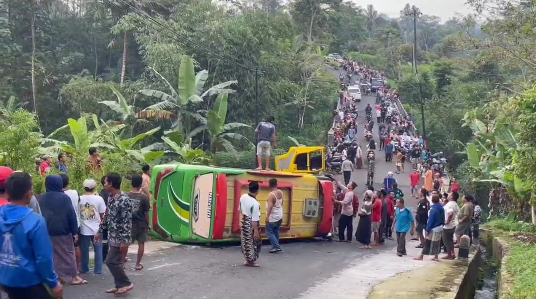 Bus Peziarah Terguling di Tanjakan Wonobodro Blado