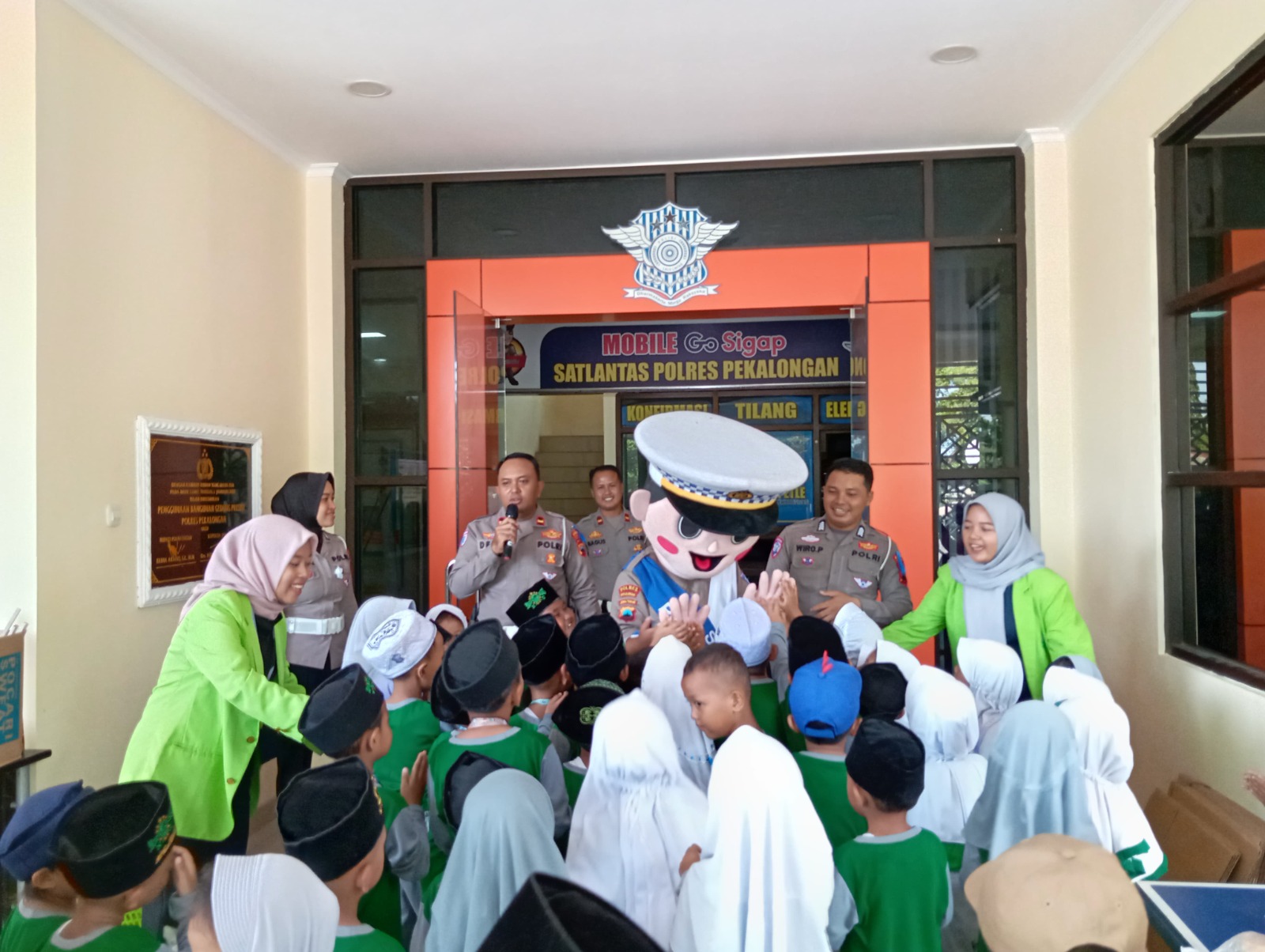 PUSKAPIK.COM, Pekalongan – Polsanak merupakan sebuah program dari kepolisian Indonesia yang bertujuan untuk mendekatkan polisi dengan anak-anak sejak usia dini. Program ini fokus pada pendidikan keselamatan, dan pengetahuan tentang aturan lalu lintas. Melalui kegiatan tersebut, Satlantas Polres Pekalongan mengajak anak-anak TK Muslimat NU Sragi untuk tertib berlalu lintas sejak dini.