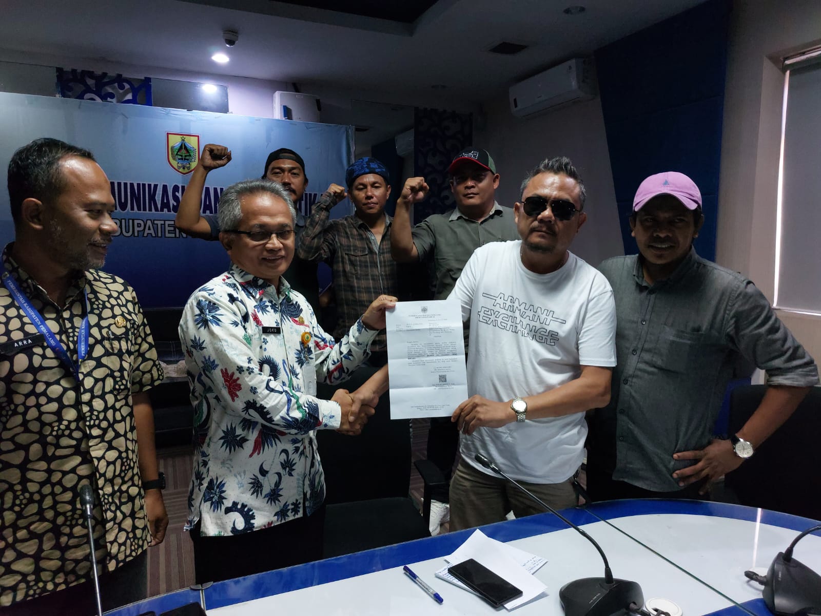Surat pencabutan diserahkan Kepala Diskominfo Pemalang, Joko Ngatmo kepada koordinator AMPEL Kabupaten Pemalang, Muliadi, di Command Room Kantor Diskominfo Pemalang, Jumat (3/1/2025).