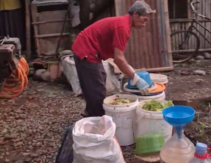 "Jadi sisa makanan seperti nasi atau lauk itu tinggal dicampur dengan air leri (air cucian beras) nanti secara otomatis akan terfermentasi, kalau pengen cepat lagi ditambah cairan EM4, tinggal tambah bekatul, sudah jadi pakan." jelas Imam.